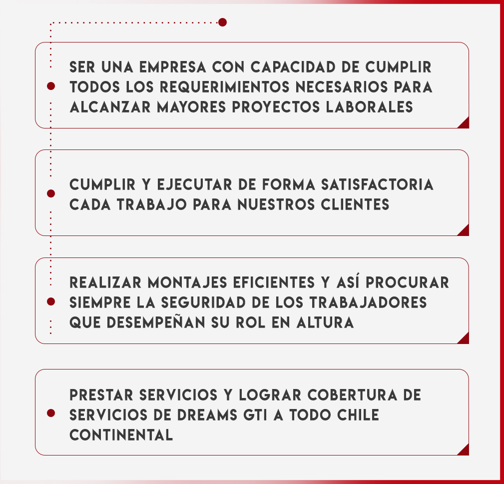 En Dream GTI, nos especializamos en cumplir con todos los requerimientos necesarios para ejecutar proyectos laborales de gran envergadura. Nos comprometemos a realizar montajes eficientes y seguros, asegurando siempre el bienestar de nuestros trabajadores. Ofrecemos servicios de alta calidad, enfocados en satisfacer las necesidades de nuestros clientes y garantizar resultados óptimos en cada tarea que emprendemos.»