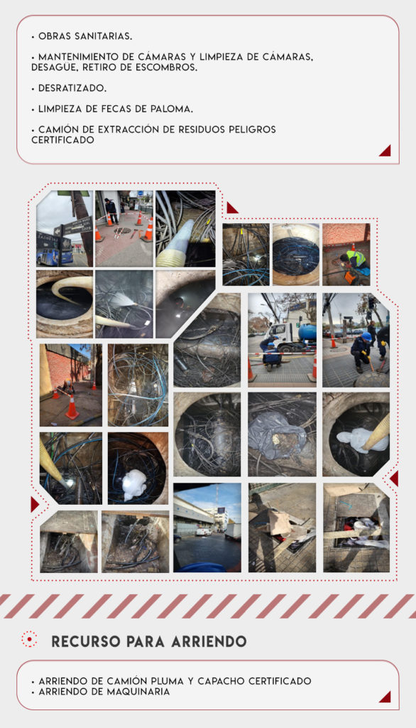 Dreams GTI ofrece servicios de obras sanitarias, como mantenimiento y limpieza de cámaras y desagües, retiro de escombros, desratizado y limpieza de fecas de paloma. También contamos con camión de extracción de residuos peligrosos certificado. Además, ofrecemos arriendo de camión pluma y capacho certificado, así como arriendo de maquinaria para diversos proyectos